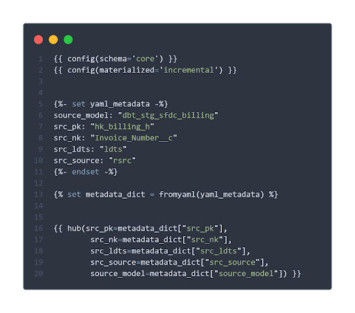 Wie aber lässt sich Data Vault 2.0 mit dbt umsetzen? Der wichtigste Aspekt bei der Verwendung von Data Vault 2.0 ist die Möglichkeit, Makros zu definieren und zu nutzen. Makros können in Modellen aufgerufen werden und erzeugen dort zusätzlichen oder sogar den gesamten SQL-Code dynamisch.